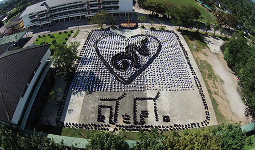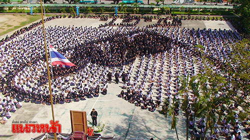 หลังจากนั้น ทุกคนได้แปรรูปขบวนเป็นตัวอักษร ๙ ล้อมรอบด้วยรูปหัวใจและวงโยธวาฑิต บรรเลงเพลง “บารมีองค์ภูมิพล” ที่ อาจารย์สนธยา บันดาล อาจารย์ดนตรีของโรงเรียนเป็นผู้แต่งเนื้อร้องและทำนองด้วยความไพเราะและเนื้อหาที่กินใจ ตามด้วยเพลงสรรเสริญพระบารมี หลังจากนั้น จึงเปิดการเรียนการสอนตามปกติ ท่ามกลางความปลื้มปิติของทุกคนที่ได้ร่วมกันถวายความอาลัยในวันนี้