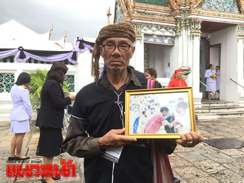 นาย จอนิ โอ่โดเชา ชาวไทยภูเขาเผ่ากะเหรี่ยง อายุ 72 ปี อาชีพทำการเกษตรและเลี้ยวสัตว์ หมู่บ้านหนองเต่า ต.แม่วิง อ.แม่วาง จ.เชียงใหม่ เป็นหนึ่งในบุคคลในภาพเหตุการณ์ กล่าวว่า ตนเคยรับเสด็จพระบาทสมเด็จพระปรมินทรมหาภูมิพลอดุลยเดช มา 5 ครั้ง เคยมีโอกาสผูกข้อมือตามหลักพิธีของเผ่าปกาเกอะญอเพื่อเรียกขวัญพระองค์ 2 ครั้ง เมื่อประมาณปี 2519 หรือเมื่อ 40 ปีที่แล้ว ขณะเสด็จฯ ไปทรงสร้างฝายเก็บน้ำให้กับหมู่บ้าน โดยตนได้อธิษฐานขอให้พระองค์มีพระชนมายุยืนยาว และเมื่อทราบว่าพระองค์เสด็จสวรรคตก็รู้สึกเสียใจมาก พระองค์เป็นกษัตริย์นักพัฒนา เสด็จฯ ไปทั่วทุกภาคในประเทศไทย แม้จะเป็นที่ทุรกันดาร เมื่อก่อนที่หมู่บ้านตนก็ไม่มีน้ำ ไม่มีไฟ และไม่มีถนน แต่พระองค์ก็เสด็จฯ มาช่วยพัฒนาหมู่บ้าน จนทำให้พวกเรามีถนน มีอ่างเก็บน้ำ และมีไฟฟ้าใช้ รวมถึงโครงการพระราชดำริต่างๆ ที่ทำให้ชีวิตพวกเราดีขึ้น แม้เราจะเป็นชาวเขา แต่พระองค์ก็ยังให้ความสำคัญ เสด็จฯ มาเยี่ยมในพื้นที่ ในวันนี้พวกเราจึงถือโอกาสนี้มากราบสักการะพระบรมศพ ซึ่งตนได้อธิษฐานให้พระองค์พักผ่อนอยู่บนสวรรคาลัย ไม่ต้องห่วงกังวล พวกเราจะนำหลักเศรษฐกิจพอเพียงของพระองค์มาปฏิบัติทั้งหมู่บ้าน