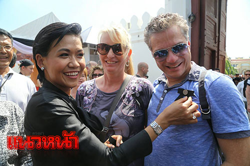 โดยโอกาสนี้ น.ส.อารยา เอฮาร์เก็ต หรือ "ชมพู่" ดารานักแสดงชื่อดัง เป็นตัวแทนกลุ่ม "ย้อมผ้าเพื่อเพื่อน" ทูลเกล้าฯถวายเสื้อผ้าที่ย้อมสีดำ จำนวน 1 แสนตัว เพื่อนำไปแจกจ่ายแก่ประชาชนที่ขาดแคลนเสื้อผ้า ทั้งนี้ ทรงมีรับสั่งกับดาราสาวว่า "ขอบใจที่นำเสื้อมาบริจาค หลายคนไม่มีสตางค์ การแบ่งปันเป็นสิ่งที่ดี" จากนั้น ทรงมีพระเมตตาห่วงใยถามว่า "เหนื่อยไหม" โดย ชมพู่-อารยา ถวายรายงานว่า "ไม่เหนื่อยค่ะ"