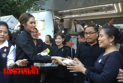ด้าน น.ส.พัชรศรี เบญจมาศ หรือ "กาละแมร์" พิธีกรชื่อดัง ที่ได้มาร่วมตั้งบูทจิตอาสา "ยืมผ้าเพื่อกราบพ่อ" บริเวณท้องสนามหลวง ได้เข้าเฝ้าฯ ทูลเกล้าฯ ถวายเงินโดยเสด็จพระราชกุศล ตามพระราชอัธยาศัย จำนวน 20,000 บาท เพื่อสมทบทุนซื้อวัตถุดิบสำหรับประกอบอาหารต่อไป ทั้งนี้ ถวายรายงานว่า เมื่อเช้ามาต่อแถวรับข้าวเหนียวไก่ทอด 30 ห่อ เพื่อให้เจ้าหน้าที่จิตอาสายืมผ้าเพื่อกราบพ่อได้รับประทาน โดยพระโสมฯทรงมีรับสั่งว่า "ดีแล้ว จิตอาสาจะได้มีกำลังใจ เพราะตอนนี้คนมาช่วยงานเยอะมาก ทั้งตำรวจ ทหาร ปอเต็กตึ๊ง และประชาชนมาช่วยกันเยอะ" นอกจากนี้ยังมี น.ส.มทิรา ตันติกระสุต หรือแยม และนาตาลี เดวิส ดารานักแสดง มาเป็นจิตอาสาร่วมแจกข้าวเหนียวไก่ทอดให้กับประชาชนด้วย
