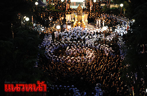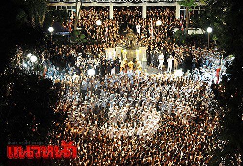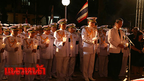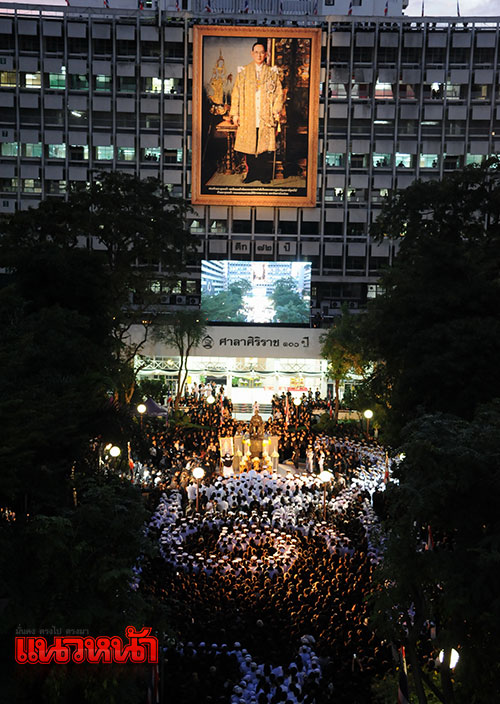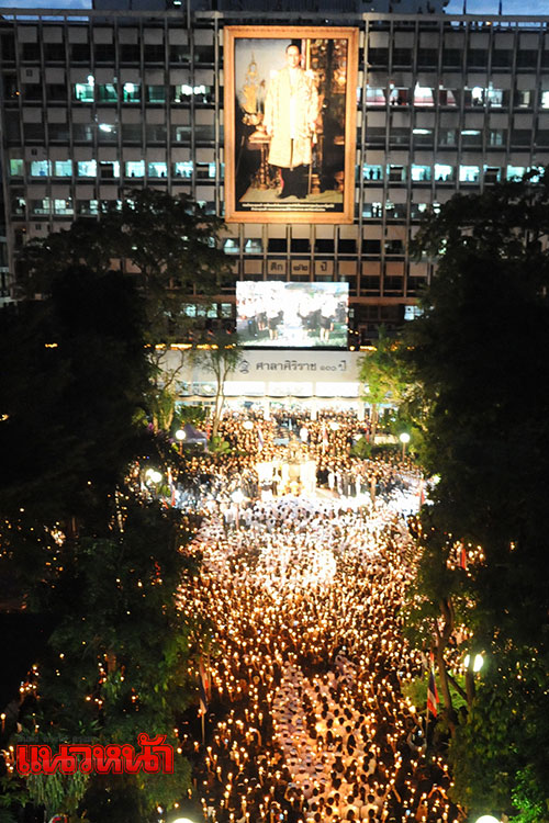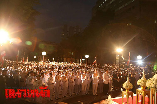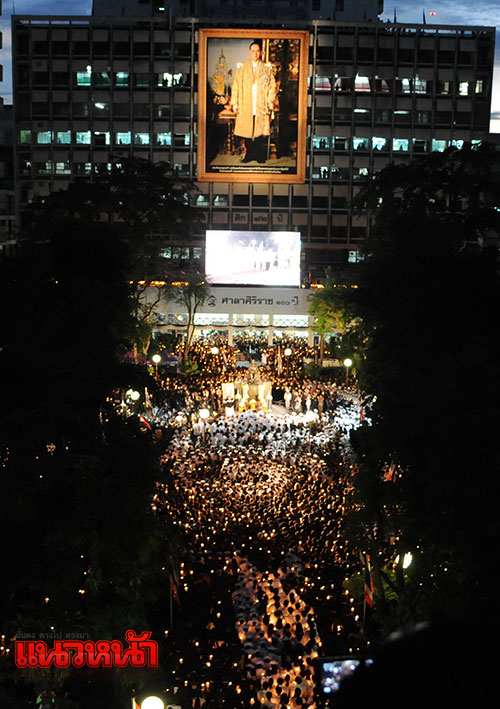 ต่อจากนั้นก็จะเป็นพิธีแสดงความอาลัย โดยมี พล.ร.อ.ณะ อารีนิจ และ ศาสตราจารย์ ดร.นายแพทย์ประสิทธิ์ วัฒนาภา คณบดีคณะแพทยศาสตร์ศิริราชพยาบาล เป็นผู้กล่าวแสดงความอาลัยแทนพสกนิกรที่มาร่วมในพิธี จากนั้นทุกท่านยืนสงบนิ่งเป็นเวลา 89 วินาที ตามด้วยการร้องเพลงสรรเสริญพระบารมี และจุดเทียนขาวให้สว่างไสวทั่วบริเวณลานพระราชานุสาวรีย์ฯ เพื่อร่วมส่งใจแสดงความอาลัยน้อมเกล้าฯ ถวายต่อพระบาทสมเด็จพระปรมินทรมหาภูมิพลอดุลยเดช ต่อด้วยเพลงต้นไม้ของพ่อ* และเพลงความฝันอันสูงสุด จบด้วยการบันทึกภาพประวัติศาสตร์เพื่อเก็บไว้ในความทรงจำของทุกคน