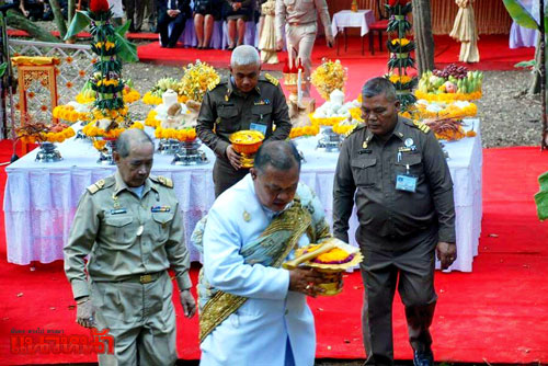 ต่อมาเวลา 13.43 น. นายวุฒิ สุมิตร รองราชเลขาธิการ สำนักพระราชวัง พร้อมด้วย นายจำลอง ยิ่งนึก ผู้อำนวยการกองราชพิธี สำนักพระราชวัง นายฉัตรชัย ปิ่นเงิน หัวหน้างานโหรพราหมณ์ นายธัญญา เนติธรรมกุล อธิบดีกรมอุทยานแห่งชาติสัตว์ป่าและพันธุ์พืช นายทวี นริสศิริกุล ผู้ว่าราชการจังหวัดประจวบคีรีขันธ์ได้เดินทางมาถึงบริเวณมณฑลพิธี บริเวณชายป่าใกล้อ่างเก็บน้ำย่านซื่อ ห่างจากที่ทำการอุทยานฯ กุยบุรีประมาณ 1 กม. โดยเริ่มพิธีด้วยการหลั่งน้ำเทพมนต์จากพระมหาสังข์