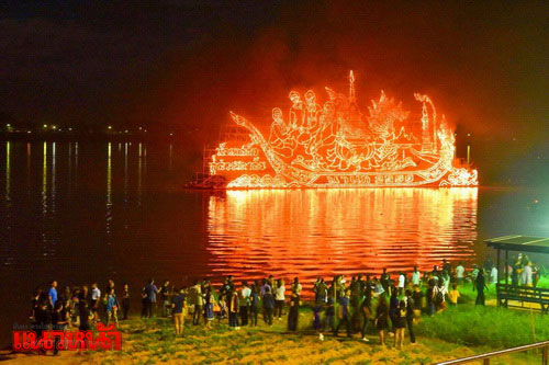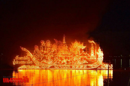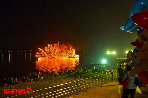หลังจากแปรอักษรเสร็จเรียบร้อย ทางกองเรือไฟ ได้ทยอยปล่อยเรือไฟออกสู่สายตานักท่องเที่ยว แต่น่าเสียดายเรือไฟจาก อ.เรณูนคร ยังไม่ทันจะโชว์ความสวยงาม เกิดไฟไหม้เรือเสียหายทั้งลำ จึงออกช่วยกันดับอย่างชุลมุน สาเหตุเกิดจากไม้ไผ่แห้งเกินไป ปะทะกับความร้อนจากตะเกียงเรือไฟนานๆก็ทำให้ไหมลุกลามเสียหายทั้งลำ ส่วนเรือไฟลำอื่นๆไม่มีปัญหา สามารถลอยลำออกมาโชว์ความยิ่งใหญ่จนครบทุกอำเภอ ผลการตัดสินปรากฎว่า เรื่อไฟ อ.โพนสวรรค์ ส่งเข้าประกวดประเภทสวยงามคว้ารางวัลที่ 1 ส่วน ม.นครพนม และ อ.เมือง ได้ที่ 2 และ 3 ตามลำดับ ด้านเรือไฟประเภทความคิด เรือไฟจาก อ.ศรีสงคราม ยังคงรักษาแชมป์ไว้ได้ ส่วน อ.นาทม และ อ.นาแก ได้ที่ 2 และ 3 ตามลำดับ