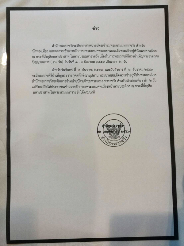 22 พ.ย.59 เมื่อเวลา 19.45 น.สำนักพระราชวังแจ้งว่า สำนักพระราชวังจะปิดการจำหน่ายบัตรเข้าชมพระบรมมหาราชวังสำหรับนักท่องเที่ยว และงดการเข้าถวายสักการะพระบรมศพพระบาทสมเด็จพระเจ้าอยู่หัวในพระบรมโกศ ณ พระที่นั่งดุสิตมหาปราสาท ในพระบรมมหาราชวัง เนื่องในการพระราชพิธีทรงบำเพ็ญพระราชกุศลปัญญาสมวาร (50 วัน) ในวันที่ 1 - 2 ธ.ค.59 เป็นเวลา 2 วัน