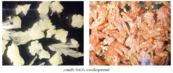 ผศ.ดร.กิตติพงศ์ ไชยนอก อาจารย์ประจำสาขาวิชาเทคโนโลยีวัสดุและสิ่งทอ คณะวิทยาศาสตร์และเทคโนโลยีมหาวิทยาลัยธรรมศาสตร์ (มธ.) ผู้คิดค้นนวัตกรรมวัสดุผงนาโนมหัศจรรย์ “ทีมอฟ” กล่าวว่า Thammasat Metal-Organic Frameworks (TMOFs) เป็นสารประกอบรูปผสมที่เกิดจากการรวมตัวกันระหว่างสารอนินทรีย์ (โลหะ) และสารอินทรีย์ (ลิแกนด์)มีลักษณะทางกายภาพเป็นของแข็งผลึกขนาดเล็กกว่าเกลือแกง มีสีสันที่เปลี่ยนแปลงไปตามสารตั้งต้นที่ใช้ หากส่องด้วยกล้องจุลทรรศน์จะเห็นเป็นผลึกคริสตัลที่มีความวาวสวยงามและมีรูปร่างที่แน่นอน