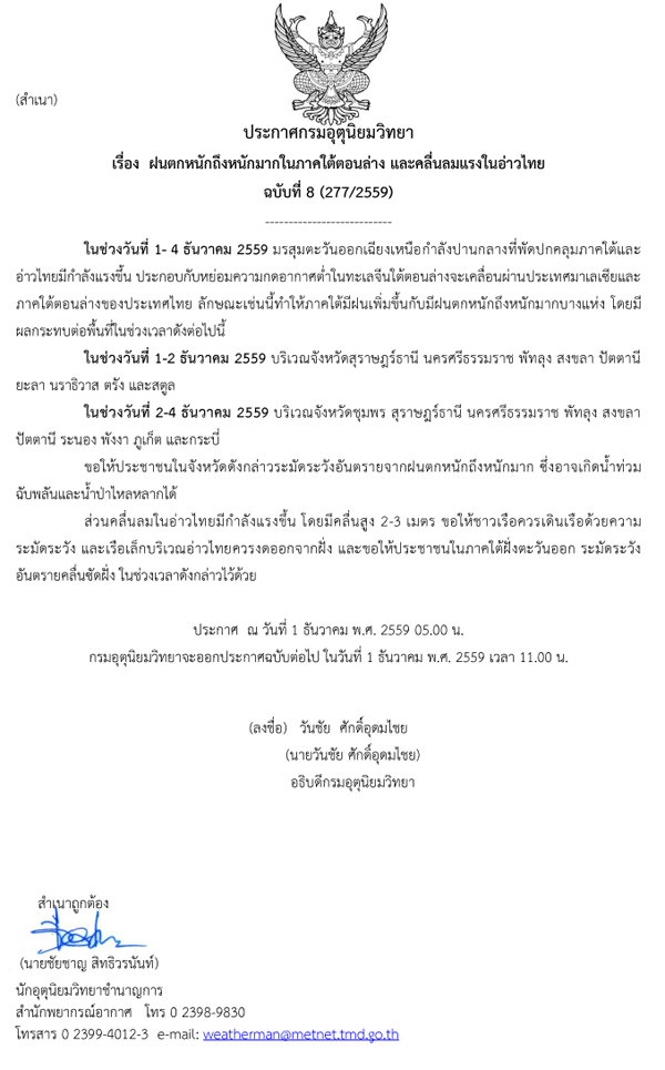 1 ธ.ค.59 กรมอุตุนิยมวิทยา ประกาศ "ฝนตกหนักถึงหนักมากในภาคใต้ตอนล่าง และคลื่นลมแรงในอ่าวไทย" ฉบับที่ 8 ระบุว่า ในช่วงวันที่ 1 - 4 ธ.ค.59 มรสุมตะวันออกเฉียงเหนือกำลังปานกลางที่พัดปกคลุมภาคใต้และอ่าวไทยมีกำลังแรงขึ้น ประกอบกับหย่อมความกดอากาศต่ำในทะเลจีนใต้ตอนล่างจะเคลื่อนผ่านประเทศมาเลเซีย และภาคใต้ตอนล่างของประเทศไทย ลักษณะเช่นนี้ทำให้ภาคใต้มีฝนเพิ่มขึ้นกับมีฝนตกหนักถึงหนักมากบางแห่ง โดยมีผลกระทบต่อพื้นที่ในช่วงเวลาดังต่อไปนี้