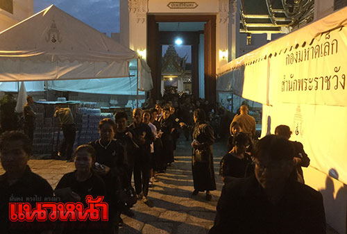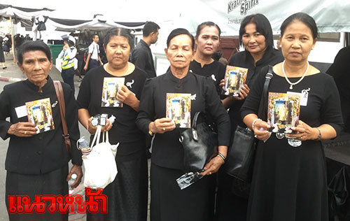 นางเต็ม นาสวาสดิ์ สมาชิกกลุ่มสตรีหนองพรานพุก ต.ทับใต้ อ.หัวหิน จ.ประจวบคีรีขันธ์ กล่าวว่า กลุ่มสมาชิกเดินทางออกจากหัวหินช่วง 4 ทุ่ม มาถึงท้องสนามหลวงประมาณตี 3 เพื่อมาเข้าคิวรอ ดีใจและปลาบปลื้มมากที่ได้มากราบสักการะพระบรมศพในหลวง ร.9 ที่เราอยู่ได้ทุกวันนี้เพราะพระองค์ทรงนำความเจริญไปให้ ทั้งสร้างอ่างเก็บน้ำเขาเต่า ทำให้ชาวบ้านมีน้ำใช้ทางการเกษตร และสร้างถนนเส้นห้วยมงคลทำให้ชาวบ้านเดินทางสะดวกสบายขึ้น ก่อนนี้เป็นถนนดินธรรมดาเดินทางลำบากมาก