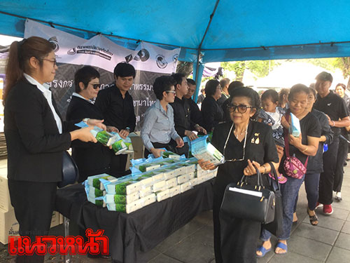 ขณะที่บริเวณฝั่งตรงข้ามประตูเทวาภิรมย์ ในพระบรมมหาราชวัง ซึ่งเป็นทางออกของประชาชนที่เดินทางมาร่วมถวายบังคมพระบรมศพ สำนักงานคณะกรรมการกำกับและส่งเสริมการประกอบธุรกิจประกันภัย (คปภ.) ภาคอุตสาหกรรมประกันภัย นำข้าวสารหอมมะลิ จำนวน 25,000 กิโลกรัม มาแจกให้กับประชาชนที่เดินทางมาถวายบังคมพระบรมศพ พระบาทสมเด็จพระปรมินทรมหาภูมิพลอดุลยเดช ตั้งแต่วันที่ 5-7 ธ.ค. ถุงละ 1 กิโลกรัม จำนวน 15,000 ถุง และระหว่างในวันที่ 8-9 ธ.ค.แจกที่หน้ากองสลาก จำนวน 10,000 ถุง เพื่อถวายเป็นพระราชกุศลแด่พระบาทสมเด็จพระปรมินทรมหาภูมิพลอดุลยเดช