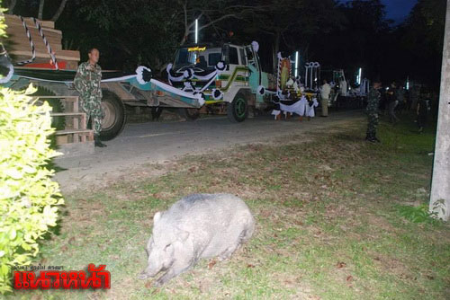 ผู้สื่อข่าวรายงานว่า ก่อนมีการประกอบพิธี "เจ้าอูด" หมูป่าเพศเมียแสนรู้ อายุ 1 ปี ซึ่งเจ้าหน้าที่อุทยานได้นำมาเลี้ยงไว้ นอนหมอบนิ่งบริเวณที่จะมีการประกอบพิธีด้านหน้ารถบรรทุกไม้จันทน์หอม เหมือนเป็นการแสดงความอาลัยในการจัดส่งมอบไม้จันทน์หอม ทำให้ผู้ร่วมงานจำนวนมากให้ความสนใจและบันทึกภาพ