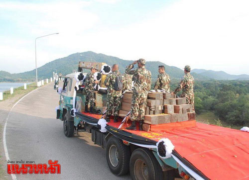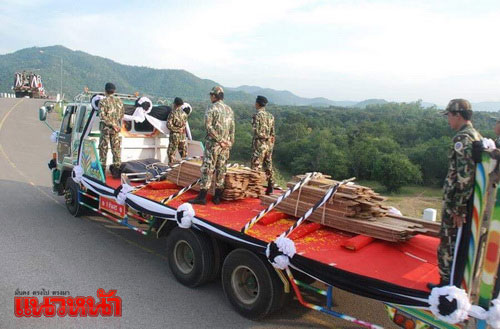 ต่อมา เมื่อเวลา 06.59 น. รถวิทยุตำรวจทางหลวงประจวบคีรีขันธ์ จากสถานีตำรวจทางหลวง 3 กองกำกับการ 2 จำนวน 3 คัน ได้นำเคลื่อนขบวนรถทั้งหมด พร้อมรถประดับผูกผ้าขาวดำจับดอกพร้อมพระบรมฉายาลักษณ์ขนาดใหญ่นำขวบวน รถบรรทุกไมจันทน์หอม ซึ่งมีเจ้าหน้าที่อุทยานฯประจำบนรถคันละ 6 นาย จากเส้นทางจากอุทยานฯ ผ่านบริเวณสันเขื่อนอ่างเก็บน้ำยางชุมอันเนื่องมาจากพระราชดำริถึงสามแยกบ้านหนองหมูระยะทาง 30 กิโลเมตร