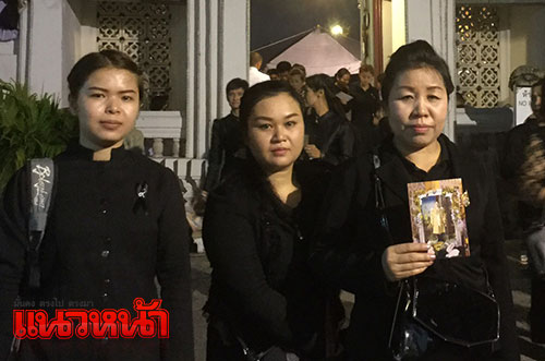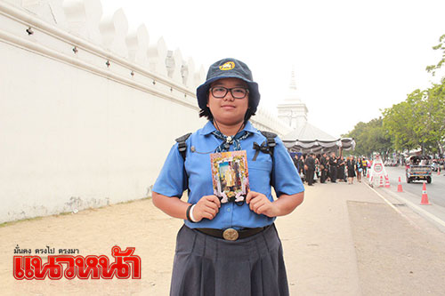 ด.ญ.ธุมวดี อินจัน หรือน้องตวง อายุ 14 ปี นักเรียนผู้บำเพ็ญประโยชน์ ชั้นมัธยมศึกษาปีที่ 3 โรงเรียนนครไทย จ.พิษณุโลก กล่าวด้วยความตื้นตันใจที่ได้มาถวายบังคมพระบรมศพ เบื้องหน้าพระบรมโกศ ว่า ดีใจมากที่ได้มีโอกาสมากราบพระบรมศพ ณ พระที่นั่งดุสิตมหาปราสาท ในพระบรมมหาราชวัง เพราะ อ.นครไทย อยู่ค่อนข้างไกลจากกรุงเทพฯ โอกาสที่จะได้เดินทางมามีไม่มากนัก เมื่อทราบจากทางโรงเรียนว่าจะมีการจัดพานักเรียนมาถวายบังคมพระบรมศพก็ตั้งตาคอย ได้ออกเดินทางโดยรถบัสจากโรงเรียน ตั้งแต่ 5 โมงเย็น วันที่ 21 ธันวาคม และเดินทางมาถึงยังบริเวณท้องสนามหลวง ราวตี 1-2 วันนี้ ก่อนจะรอต่อแถวและได้เข้ากราบถวายสักการะ ซึ่งความรู้สึกขณะที่ได้เข้าถวายบังคมในหลวงรัชกาลที่ 9 ตื้นตันใจจนกลั้นน้ำตาไว้ไม่อยู่
