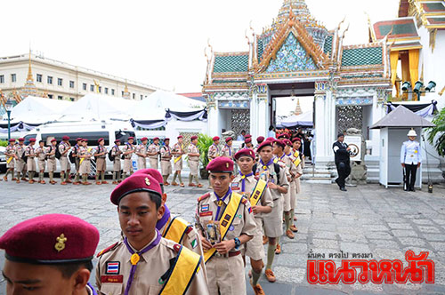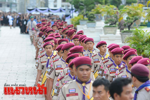 นายพัสกร โตเสน่ห์ อายุ 43 ปี หัวหน้ากิจกรรมพัฒนาผู้เรียน โรงเรียนนครไทย จ.พิษณุโลก นำคณะลูกเสือ ผู้บำเพ็ญประโยชน์ และยุวกาชาด กว่า 200 คน ร่วมกันสวมชุดเครื่องแบบกิจกรรมมาถวายบังคมพระบรมศพ โดยเปิดเผยว่า เราต่างสำนึกในพระมหากรุณาธิคุณที่มีต่อลูกเสือ พระองค์ทรงทำให้กิจการลูกเสือได้ถูกรื้อฟื้นให้คืนคงสถานะเดิมขึ้นมาอีกครั้งหนึ่ง ทำให้การลูกเสือในประเทศไทยได้เริ่มต้นเคลื่อนไหวเข้มแข็งขึ้นมาใหม่ และเพื่อถวายความเคารพต่อพระองค์ท่าน ในปีนี้จึงไม่ได้จัดให้มีการเข้าค่ายลูกเสือ