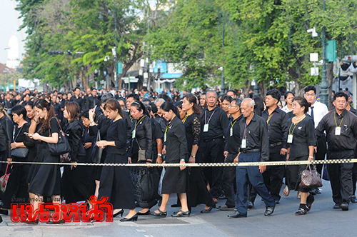 ด้าน นางชลธิชา ชาวชายโขง อายุ 54 ปี ชาว จ.หนองคาย อาชีพขายเส้นขนมจีนอยู่ที่ตลาดสดสามแยกเจดีย์ จ.สมุทรปราการ กล่าวว่า ตนเดินทางมาพร้อมกับ น.ส.ทักษพร เล่าหะวิลัย นักศึกษาชั้นปีที่ 1 มหาวิทยาลัยมหาสารคาม ถึงท้องสนามหลวงประมาณตี 3 จึงได้เข้ากราบถวายบังคมพระบรมศพเป็นคณะแรกๆ
