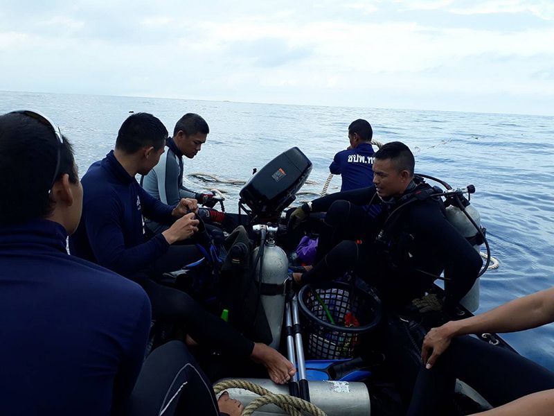 และเมื่อช่วงเช้าของวันนี้ 7 ม.ค.61 ได้สั่งการให้ เรือตรวจการณ์ 995 (เรือต.995) โดยเรือเอกภาณุพงศ์ จำเริญวงศ์ ผบ.เรือ ต.995 และชุดปฏิบัติการพิเศษ ทรภ.1 (ชปพ.ทรภ.1) นำโดยเรือเอก นิตินันท์ รอดทองคำ หน.ชุด ชปพ.ทรภ.1 นำลูกชุดรวม 7 คน พร้อมเรือยางและอุปกรณ์ดำน้ำเดินทางเข้าพื้นที่จุดเรือจม เข้าดำเนินการผูกมัดเรือเรียบร้อย
