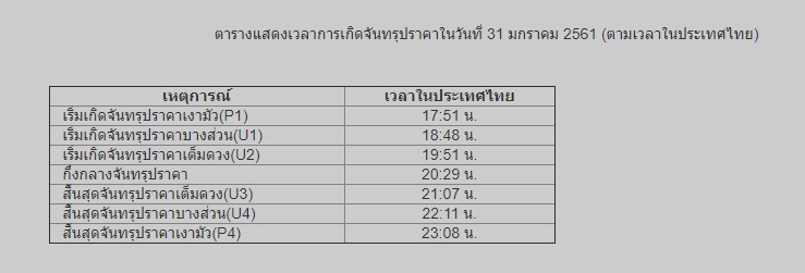 สำหรับปรากฏการณ์จันทรุปราคาเต็มดวงในวันที่ 31 มกราคม 2561 ดวงจันทร์เริ่มเข้าสู่เงามัวของโลกตั้งแต่เวลา 17:51 น. จากนั้นค่อย ๆ เคลื่อนเข้าสู่เงามืดของโลก เกิดเป็นจันทรุปราคาบางส่วนในเวลา 18:48 น. และเข้าสู่จันทรุปราคาเต็มดวงตั้งแต่เวลา 19:51-21:07 น. เกิดจันทรุปราคาเต็มดวงนาน 1 ชั่วโมง 16 นาที ช่วงเวลาดังกล่าวดวงจันทร์อยู่ในเงามืดของโลกเต็มดวง จะมองเห็นดวงจันทร์เป็นสีแดงอิฐทั้งดวง