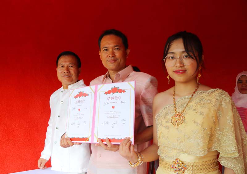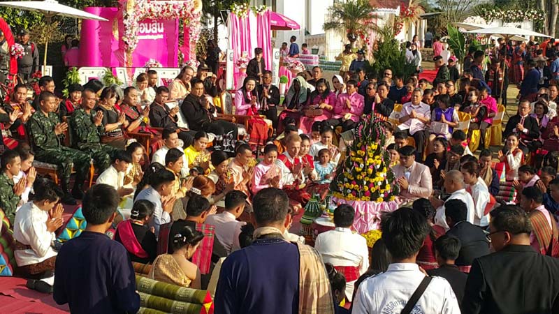 โดยเริ่มจากขบวนแห่ช้าง 3 เชือก ขบวนแห่ขันหมาก 4 เผ่าไทย ผู้เข้าร่วมขบวนแห่มาในชุดท้องถิ่นของเผ่า ส่วย ลาว เขมร และเยอ มีไฮไลท์จดทะเบียนบนหลังช้าง ก่อนเข้าสู่การประกอบพิธีมงคลแบบพื้นถิ่น บายศรีสู่ขวัญ พิธีพราหมณ์แบบอีสานโบราณ เพื่อความเป็นศิริมงคลแก่คู่บ่าวสาวทั้ง 49 คู่ และเพื่อสื่อความหมายให้ความรักแน่นแหนียว ได้มอบกระติ๊บข้าวเหนียวพร้อมอาหารถือเป็นมื้อแรกของการใช้ชีวิตคู่แก่คู่บ่าวสาวด้วย ท่ามกลางบรรยากาศลมหนาวที่ยังคงพัดผ่านในพื้นที่ชายแดนแต่อบอุ่นด้วยความรักของคู่บ่าวสาวที่จูงมือเข้าร่วมกิจกรรม