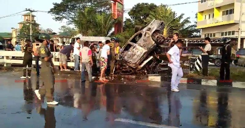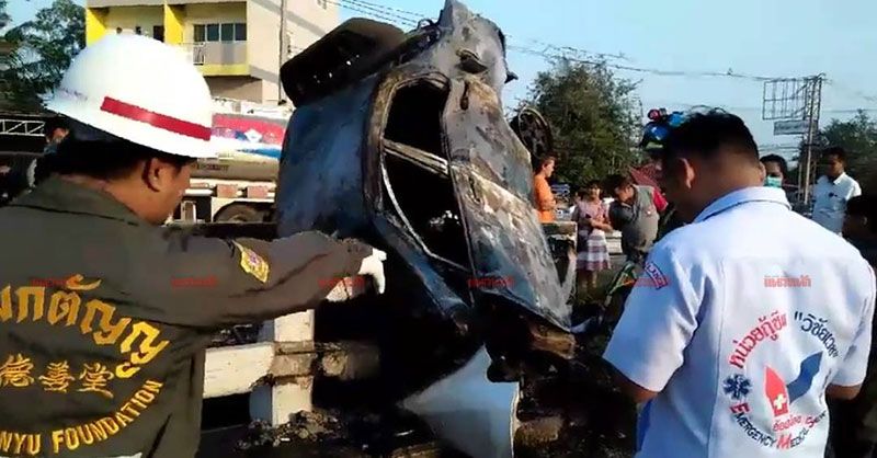 1 มี.ค. 61 ผู้สื่อข่าวรายงานว่า บนถนนพุทธสาคร ขาเข้ากระทุ่มแบน จ.สมุทรสาคร ฝั่งตรงข้ามกับหน้าร้านอาหารเดอะไนท์รีสอร์ท เกิดเหตุรถยนต์พุ่งชนเสยติดเข้าไปกับราวสะพานไฟลุกท่วมทั้งคัน ทางเจ้าหน้าที่จึงรีบประสานรถน้ำดับเพลิงจากเทศบาลตำบลสวนหลวง นำน้ำเข้าฉีดซึ่งใช้เวลาประมาณ 15 นาที ไฟจึงดับสนิทลง เจ้าหน้าที่จึงเข้าตรวจสอบภายในรถยนต์ยี่ห้อฮอนด้าซิตี้ สีบอร์นเงิน หมายเลขทะเบียน กจ 8012 อุดรธานี ที่ถูกไฟไหม้พบคนขับรถและผู้ที่นั่งข้างมาได้ถูกไฟคลอกเสียชีวิตติดอยู่ภายในรถ