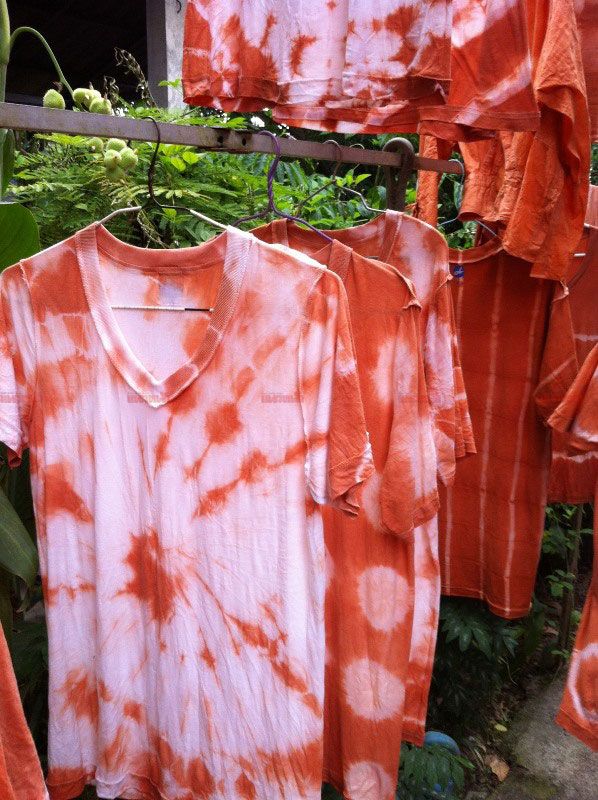 สำหรับกระบวนการสกัดสีจากดินเป็นขั้นตอนที่ต้องใช้ความพยายามสูง เริ่มจากการนำดินมาต้มจนได้สี จากนั้นก็ต้องกรองแยกเศษดินออกให้หมดเอาเฉพาะน้ำเพื่อนำไปย้อมสีผ้าตามลวดลายที่ต้องการ ขั้นตอนการกรองเป็นสิ่งที่สำคัญที่ต้องกรองแล้วกรองอีกจนกว่าจะมั่นใจว่าสะอาดจริง “การสกัดสีจากดินจะได้สีย้อมผ้าเป็นสีโทนส้มอ่อนๆ คล้ายสีก้อนอิฐ เมื่อกรองหลายๆ ครั้งก็จะได้สีสันที่แตกต่างกันออกไปตามความเข้มอ่อนของดิน ส่วนเปลือกกล้วยหินก็มีลักษณะการทำคล้ายๆกัน โดยการนำเปลือกกล้วยไปตากแดดก่อนสัก 1-2 วัน เพื่อให้แห้งจัด หลังจากนั้นก็นำมาหั่นเป็นชิ้นเล็กๆ แล้วนำไปใส่ในกระทะที่น้ำเดือด รอสักพัก จนได้สีของเปลือกกล้วยแล้วนำเสื้อผ้าที่จะย้อมใส่ไปในกระทะจนได้ที แล้วนำขึ้นมาล้างน้ำสะอาดก็จะได้สีที่ดูสวยงามมาก” นายปิยะ กล่าว