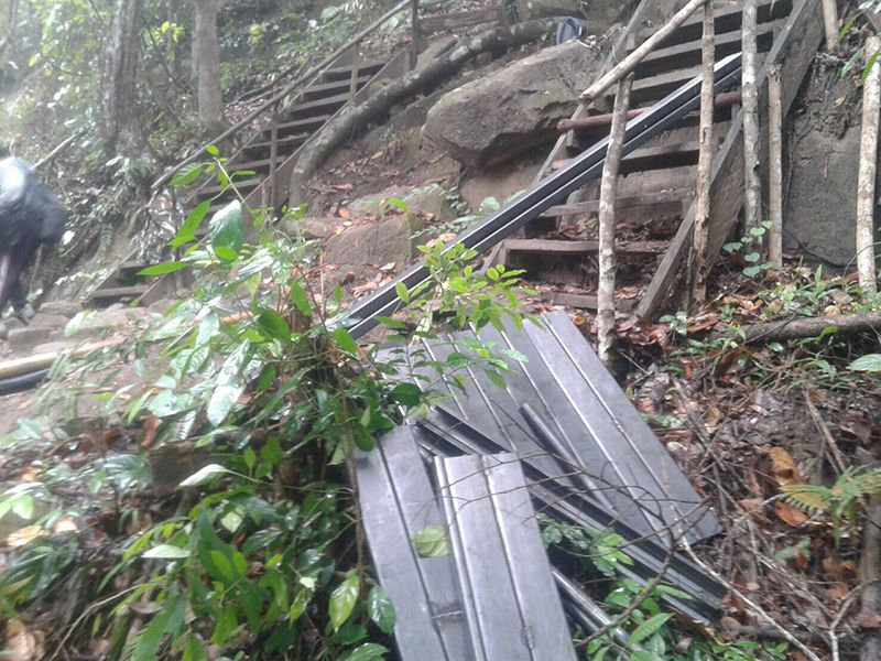 ทั้งเจ้าหน้าที่อุทยานฯ ลูกหาบ ช่วยกันซ่อมแซมทางเดินบันได สะพาน ซึ่งบันไดชุดเดิมเป็นไม้ต้องทำการซ่อมแซมทุกๆปี ดังนั้นเพื่อความมั่นคง ถาวรแข็งแรงและเพื่อความปลอดภัย จึงทำการปรับปรุงซ่อมแซมโดยใช้เหล็กแทน