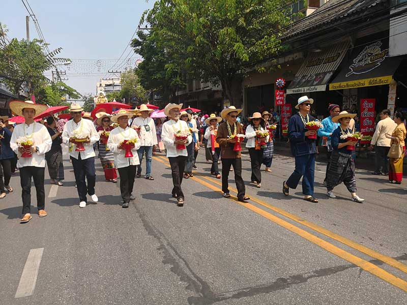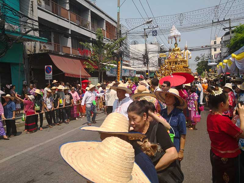 จากนั้นเมื่อเวลา 13.30 น. ได้มีพิธีอัญเชิญพระพุทธสิหิงค์ขึ้นประดิษฐานบนรถบุษบกแห่ไปรอบเมือง ตั้งแต่สี่แยกสันป่าข่อยมาจนถึงวัดพระสิงห์วรมหาวิหาร ซึ่งเป็นประเพณีที่จะจัดขึ้นทุกปีก่อนงานป๋าเวณีปี๋ใหม่เมือง (สงกรานต์) เพื่อความร่มเย็นเป็นสุข และเป็นสิริมงคล เพื่อให้พุทธศาสนิกชนได้สรงน้ำสักการบูชาตลอดเทศกาลสงกรานต์ ประกอบกับชาวเชียงใหม่ เชื่อกันว่าอำนาจบุญบารมีและความศักดิ์สิทธิ์ของพระพุทธสิหิงค์จะดลบันดาลให้บ้านเมืองมีความสงบร่มเย็นเป็นสุข ฝนตกต้องตามฤดูกาล พืชพันธุ์ธัญญาหารอุดมสมบูรณ์ และจะขจัดภัยพิบัติทั้งหลายทั้งปวงก็จะเบาบางให้คลายไปในทางที่ดี