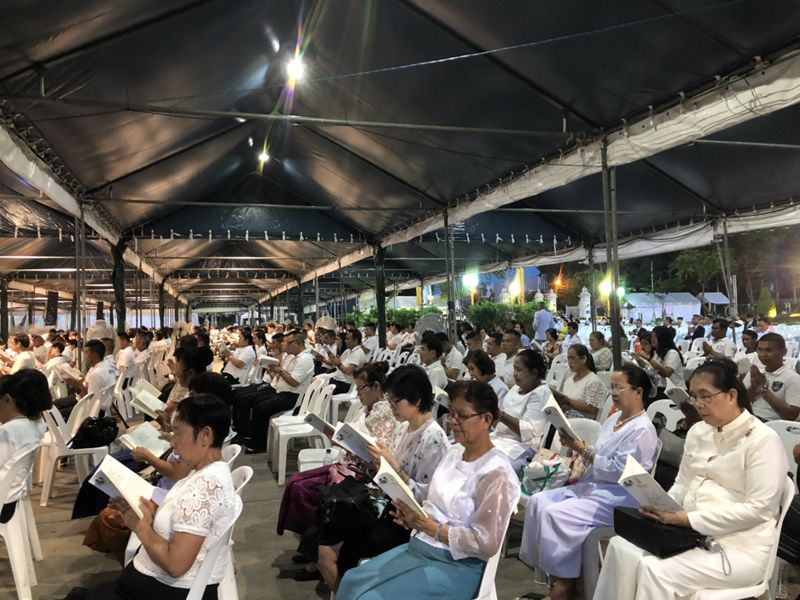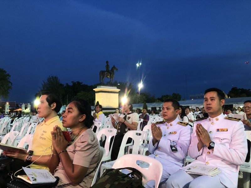 ผู้สื่อข่าวรายงานว่า ตั้งแต่ช่วงบ่ายได้มีพุทธศาสนิกชนจำนวนมากแต่งกายสีขาวทยอยเดินทางมาจับจองที่นั่ง ซึ่งเจ้าหน้าได้จัดเตรียมเก้าอี้และเบาะรองนั่งไว้ภายในเต้นท์ พร้อมนำหนังสือสวดมนต์พระราชทาน มาแจกให้กับประชาชนที่เดินทางมาร่วมสวดมนต์ เพื่อความเป็นสิริมงคลและความสุขของประชาชนทุกหมู่เหล่า ผู้มีศรัทธาบำเพ็ญธรรมได้ร่วมสวดมนต์อุทิศถวายเป็นพระราชกุศในครั้งนี้ด้วย