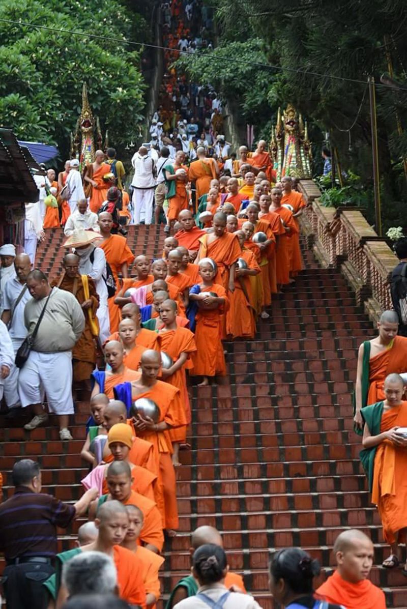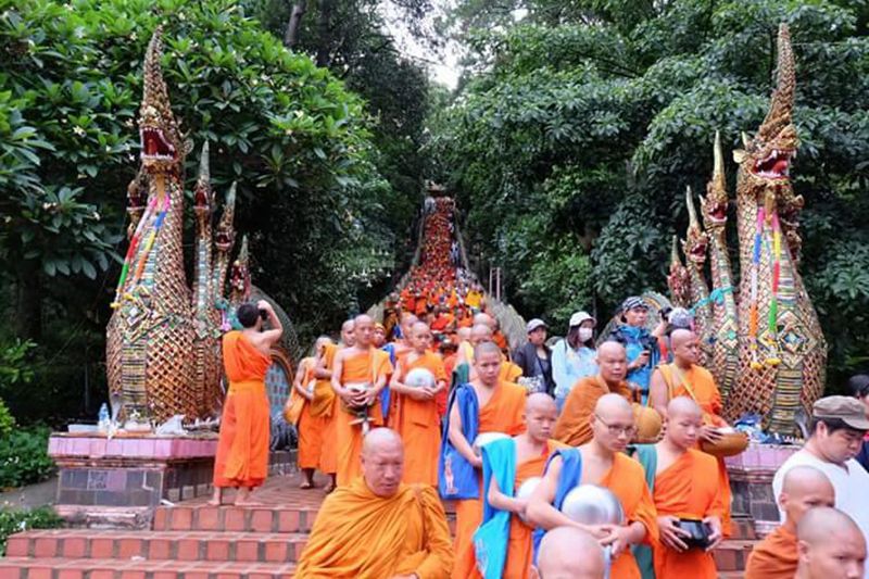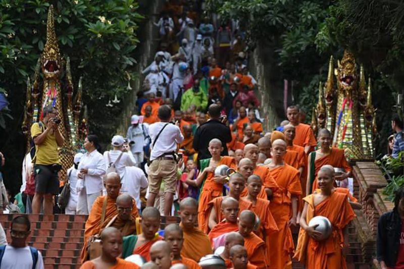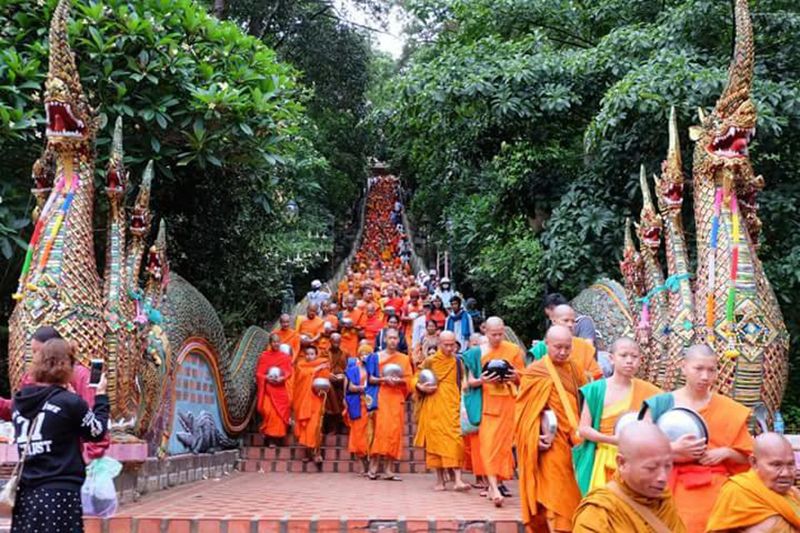 29 พ.ค.61 ผู้สื่อข่าวรางานว่าเมื่อช่วงเช้าที่ผ่านมา ที่หน้าบันไดวันพระธาตุดอยสุเทพ อ.เมือง จ.เชียงใหม่ ซึ่งเป็นวัดสำคัญของจังหวัดเชียงใหม่ ได้มีพุทธศาสนิกชนทั้งชาวเชียงใหม่ และผู้คนที่เดินทางมาจากต่างจังหวัดรวมถึงนักท่องเที่ยวต่างชาติจำนวนหลายพันคน ได้ร่วมทำบุญตักบาตร โดยมีพระสงฆ์ สามเณรจากวัดต่างๆ ทั่วเมืองเชียงใหม่ จำนวนกว่า 700 รูป ได้เดินมาบิณฑบาต บริเวณทางลงมาจากบันไดนาค เนื่องในวันวิสาขบูชา