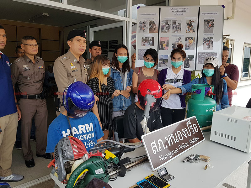 1 มิ.ย.61 พ.ต.อ.ชิตเดชา สองห้อง ผกก. สภ.หนองปรือ จ.ชลบุรี พร้อมด้วย พ.ต.ท.ณัฐกร มงคลมหา สว.สส. พ.ต.ต.เก่งศาสตร์ นวลพงษ์ สวป. พร้อมเจ้าหน้าที่ตำรวจชุดสืบสวน ร่วมกันแถลงข่าวการจับกุมคนร้าย 3 คดี ผู้ต้องหา 4 คน พร้อมของกลาง