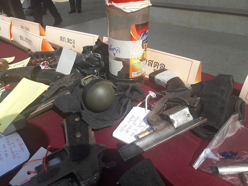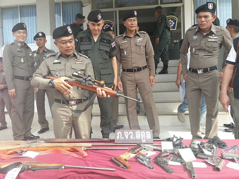 10 มิ.ย. 61 ที่กองบังคับการตำรวจภูธรจังหวัดสตูล พล.ต.ต.ศุภวัฒน์ ทับเคลียว ผบก.ภ.จว.สตูล พร้อมพ.ต.อ.ธรรมนูญ ประยืนยง รองผบก.ภ.จว.สตูล พร้อมผกก.ประจำสภ.ต่างๆ ในจ.สตูล ร่วมกันนำอาวุธปืนของกลาง 17 รายการ พร้อมเครื่องกระสุน 73 นัด และวัตถุระเบิด 1 ลูก ได้พร้อมผู้ต้องหา 17 คน มาแถลงผลการปฏิบัติงาน หลังระดมกวาดล้างอาชญากรรมตายุทธการขุดรากถอนโคนอาชญากรรมทำบ้านเมืองน่าอยู่ ห้วงวันที่ 28 พ.ค.- 11 มิ.ย.2561 รวมทั้งสิ้น 218 รายการ ผู้ต้องหา 227 คน ในระยะเวลา 14 วัน