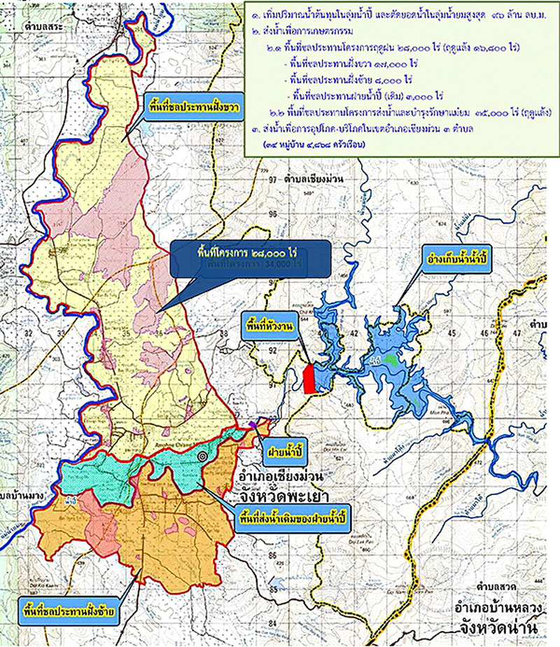 นายประพิศ จันทร์มา รองอธิบดีฝ่ายก่อสร้าง กรมชลประทาน กล่าวว่า โครงการอ่างเก็บน้ำน้ำปี้อันเนื่องมาจากพระราชดำริ เป็นโครงการพัฒนาแหล่งน้ำขนาดกลาง ตัวเขื่อนเป็นคอนกรีตบดอัดแห่งแรกขอประเทศไทยที่ออกแบบโดยกรมชลประทาน สร้างกั้นลำน้ำปี้ ซึ่งเป็นสาขาของแม่น้ำยม ที่บ้านปิน ตำบลเชียงม่วน อำเภอเชียงม่วน จังหวัดพะเยา สันเขื่อนมีความยาว 810.00 เมตร กว้าง 8.00 เมตร สูง 54.00 เมตร มีความจุที่ระดับเก็บกัก 90.50 ล้านลูกบาศก์เมตร(ลบ.ม.) พร้อมทั้งจะมีการก่อสร้างระบบส่งน้ำโดยท่อความยาวประมาณ 75.00 กิโลเมตร