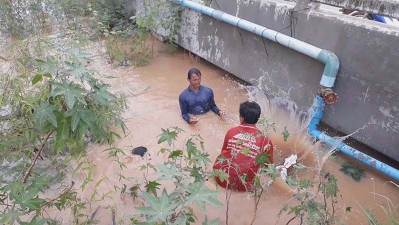 22 ส.ค.61 ผู้สื่อข่าวรายงานว่า หลังมวลน้ำจาก จ.แพร่ ไหลลงมาสมทบกับแม่น้ำยมที่ จ.สุโขทัย ทำให้ระดับน้ำเพิ่มสูงขึ้นต่อเนื่อง และยังทะลักเข้าท่อระบายน้ำจนท่วมถนนบางจุดภายในวัดศรีสังวร หมู่ 6 บ้านท่าช้าง ต.ทับผึ้ง อ.ศรีสำโรง ชาวบ้านจึงช่วยกันเร่งกรอกกระสอบทรายนำไปวางอุดท่อ ตรงบริเวณคอสะพานคลองท่าช้าง เพื่อป้องกันไม่ให้น้ำไหลย้อนเข้าท่อระบายไปท่วมวัดและโรงเรียนวัดศรีสังวร เพิ่มอีก