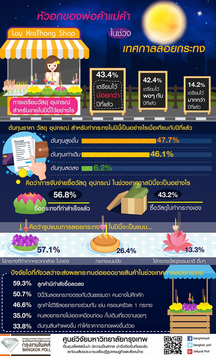 เนื่องด้วยในวันที่ 22 พ.ย.61 ตรงกับวันลอยกระทง กรุงเทพโพลล์โดยศูนย์วิจัยมหาวิทยาลัยกรุงเทพ จึงสำรวจความคิดเห็นของพ่อค้าแม่ค้าเรื่อง “หัวอกของพ่อค้าแม่ค้าในช่วงเทศกาลลอยกระทง” โดยเก็บข้อมูลเฉพาะพ่อค้า แม่ค้า ที่ขายวัสดุอุปกรณ์สำหรับประดิษฐ์กระทงและกระทงสำเร็จตามตลาดหลายๆ แห่งในกรุงเทพมหานครและปริมณฑล จำนวน 436 ร้านค้า