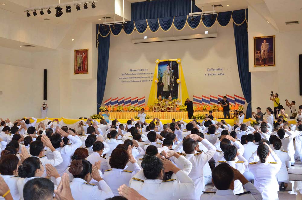 จากนั้นเมื่อเวลา 09.00 น.ที่หอประชุมจังหวัดกาฬสินธุ์ ศูนย์ราชการจังหวัดกาฬสินธุ์ นายไกรสร กองฉลาด ผู้ว่าราชการจังหวัดกาฬสินธุ์ พร้อมด้วยนายฉันชาย โรจนสโรช ผู้พิพากษาหัวหน้าศาลจังหวัดกาฬสินธุ์ พล.ต.จุมพล จุมพลภักดี ผู้บัญชาการกองพลทหารม้าที่ 3 ในฐานะผู้บัญชาการกองกำลังรักษาความสงบเรียบร้อย จ.กาฬสินธุ์ พล.ต.ต.ทินณะรัตน์ เพ็ชรพันธ์ศรี ผู้บังคับการตำรวจภูธรจังหวีดกาฬสินธุ์นำส่วนราชการ ตำรวจ ทหาร คณะกรรมการเหล่ากาชาด หน่วยงานรัฐวิสาหกิจและประชาชนร่วมกันประกอบพิธีถวายพานพุ่มราชสักการะ เบื้องหน้าพระบรมฉายาลักษณ์ กล่าวถวายราชสดุดี พร้อมถวายบังคม น้อมรำลึกในพระมหากรุณาธิคุณของพระบาทสมเด็จพระปรมินทรมหาภูมิพลอดุลยเดช บรมนาถบพิตร ที่มีต่อพสกนิกรปวงชนชาวไทยทุกหมู่เหล่า โดยเฉพาะทรงพระราชทานโครงการอันเนื่องมากจากพระราชดำริมากว่า 4,000 โครงการ ทำให้พสกนิกรมีความอยู่ดี กินดี มีรายได้ อย่างเป็นรูปธรรมและมีความผาสุกจวบจนทุกวันนี้