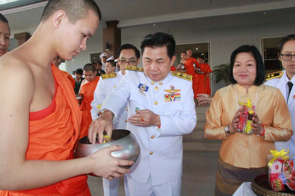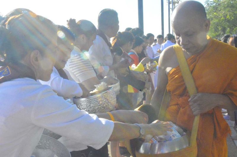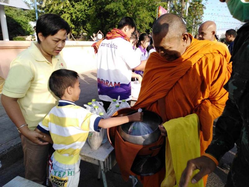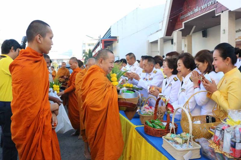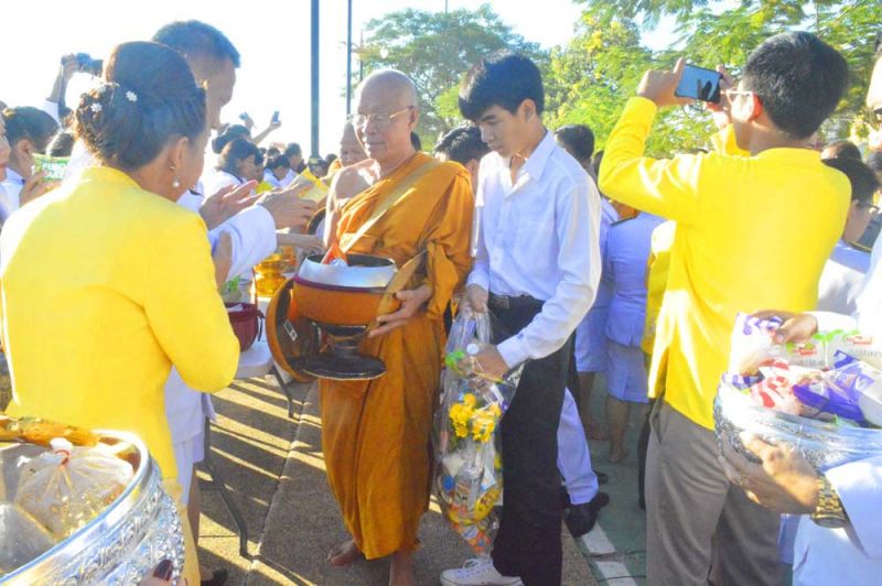 เมื่อเวลา 07.00 น. นายธีรวัฒน์ วุฒิคุณ ผู้ว่าราชการจังหวัดบุรีรัมย์ พร้อมด้วยนางธัญลักษณ์ วุฒิคุณ นายกเหล่ากาชาดจังหวัดบุรีรัมย์ พลตรีรณกร ปานกุล ผู้บัญชาการมณฑลทหารบกที่ 26 พล.ต.ต.วีรพล เจริญศิริ ผู้บังคับการตำรวจภูธรจังหวัด รองผู้ว่าราชการจังหวัด ข้าราชการ พ่อค้า ประชาชน นักเรียน นักศึกษา และพสกนิกรทุกหมู่เหล่ากว่า 1,000 คน ได้พร้อมใจกันสวมใส่เสื้อสีเหลือง นำข้าวสารอาหารแห้ง และจตุปัจจัย มาร่วมทำบุญตักบาตรแด่พระภิกษุสงฆ์ สามเณร จำนวน 99 รูป ที่บริเวณถนนรมย์ ด้านหน้าสำนักงานเทศบาลเมืองบุรีรัมย์ เพื่อถวายเป็นพระราชกุศล แด่พระบาทสมเด็จพระปรมินทรมหาภูมิพลอดุลยเดช เนื่องในวันคล้ายวันเฉลิมพระชนมพรรษา วันชาติ และวันพ่อแห่งชาติ รวมทั้งเพื่อเป็นสิริมงคลแก่ตนเองและครอบครัวด้วย