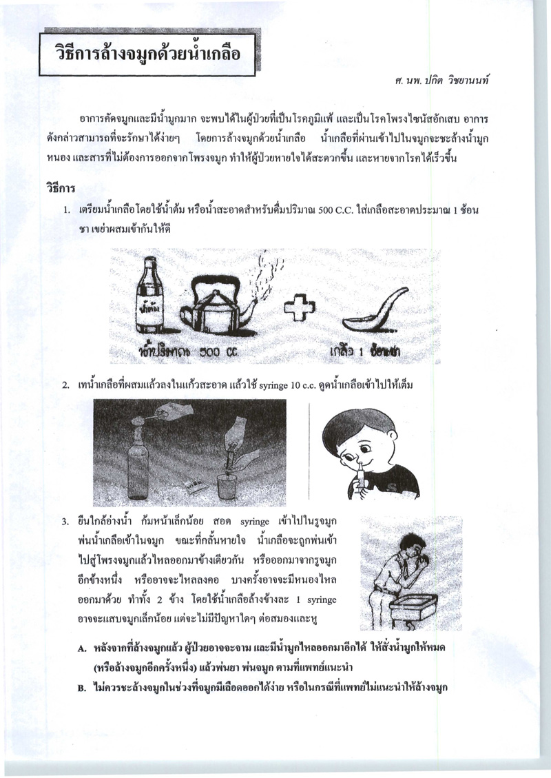 เอาน้ำต้มสุก หรือ น้ำสะอาด พักให้เย็นที่อุณหภูมิห้อง ปริมาณ 500 cc ผสมเกลือ 1 ช้อนชา เขย่าๆ แค่นี้ก็ใช้แทนน้ำเกลือล้างจมูกได้ "