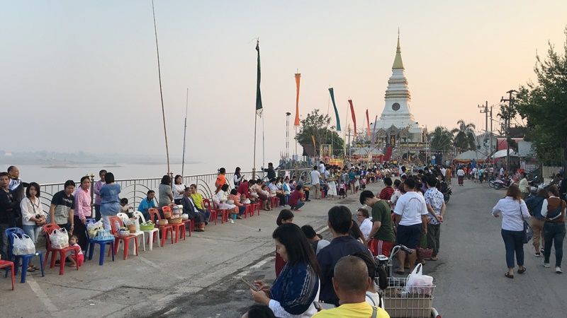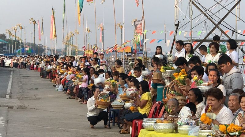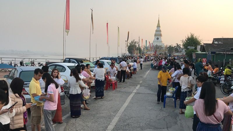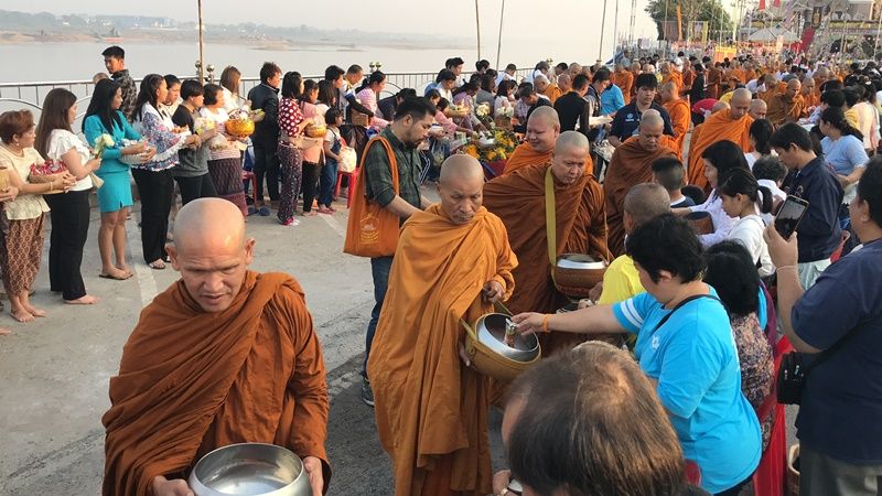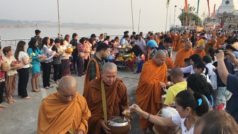 ผู้ว่าฯหนองคาย นำข้าราชการ นักเรียน นักศึกษา และพุทธศาสนิกชนไทย-ลาว ทำบุญตักบาตร พระสงฆ์ 69 รูป และเวียนเทียน รอบพระอุโบสถ วัดโพธิ์ชัย พระอารามหลวง วัดที่ประดิษฐานองค์หลวงพ่อพระใส พระคู่บ้านคู่เมืองหนองคาย เนื่องวันมาฆบูชา ในขณะที่นายกเทศมนตรีเมืองหนองคาย นำพุทธศาสนิกชนไทย-ลาว ตักบาตรริมฝั่งแม่น้ำโขง ที่พระธาตุกลางน้ำ จุดลอยอังคารเถ้าอัฐิหลวงพ่อคูณ