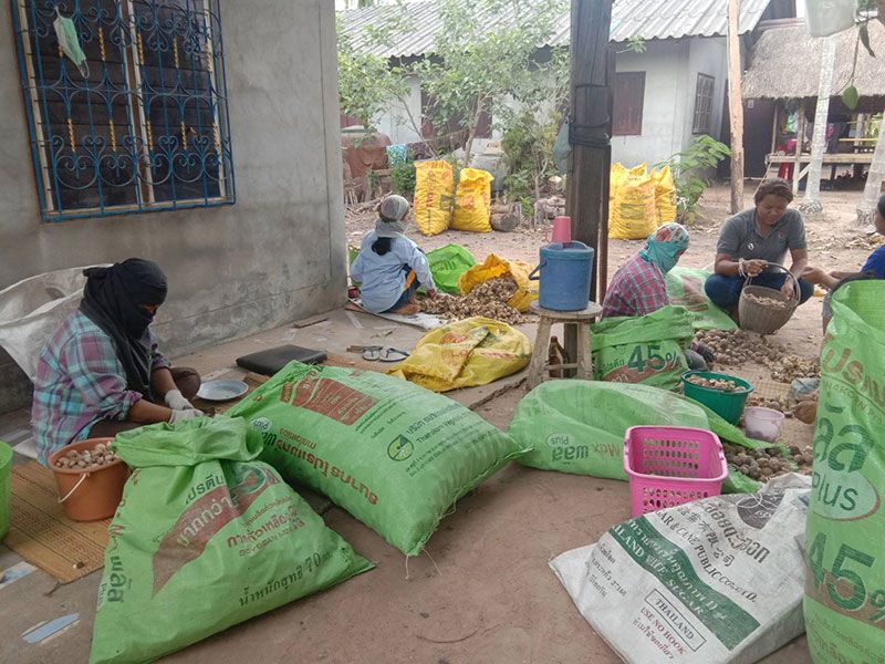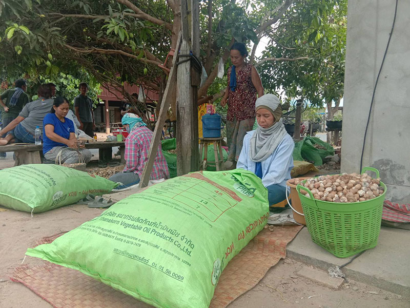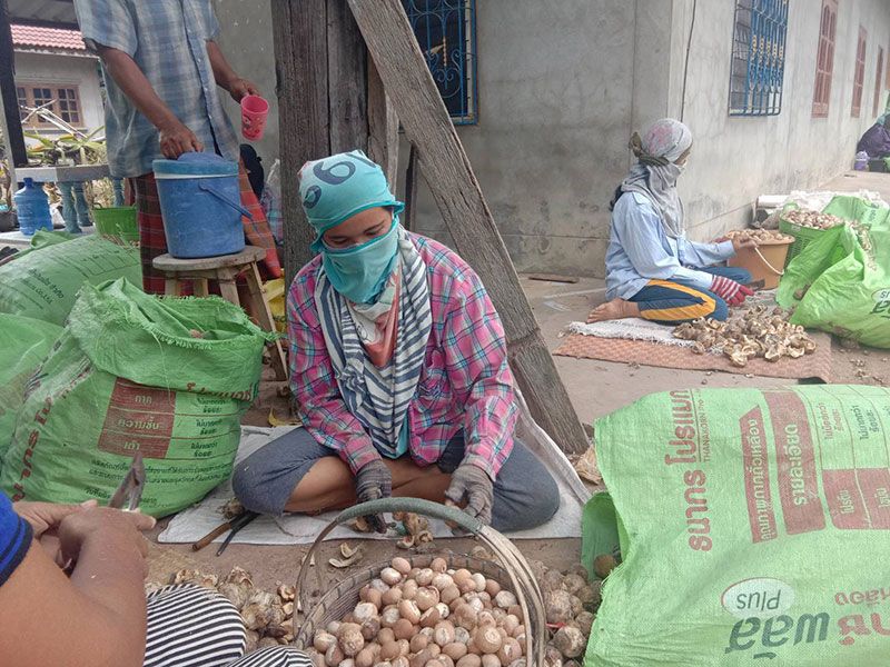 นางสมพงษ์ มีสิทธิ์ อายุ 50 ปี เล่าว่า ชาวบ้านต่างคนต่างมา บางคนปอกหมากแห้ง คนเร็วได้วันละประมาณ 30 ก.ก. คนช้าหน่อยก็ได้วันละ 20 ก.ก. ก็พอได้ค่ากับข้าว นั่งปอกหมากแห้งไปเรื่อยๆ คนในหมู่บ้านจะออกไปหาซื้อหมากมาตากแห้ง แล้วจ้างชาวบ้านมานั่งปอกเปลือกออก โดยให้ค่าจ้าง ก.ก.ละ 4 บาท แต่ละคนจะมีรายได้ประมาณวันละ 100-120 บาท ก็พอได้ค่ากับข้าว แบ่งเบาภาระครอบครัวได้เป็นอย่างดี ในช่วงหน้าแล้ง หลังฤดูการทำนาปีแบบนี้
