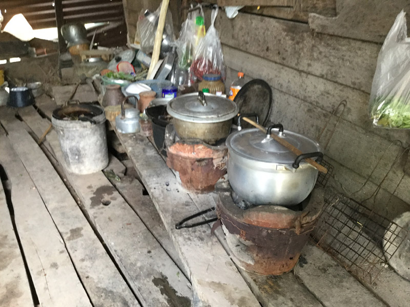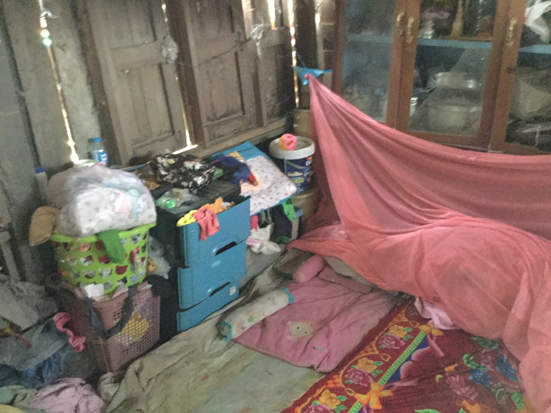 เวลาฝนตกน้ำรั่วเปียก ตะปูหลุดออกใช้ไม้มาทับไว้ไม่ให้ปลิวเวลาที่โดนลมแรง ผนังบ้านบ้อมด้วยแผ่นไม้สภาพผุพัง ใช้ป้ายโฆษณาเก่ามาปิดบังแดดและฝน ในตัวบ้านไม่มีการกั้นห้อง ทุกคนนอนอยู่ด้วยกันในบ้านหลังเดียว ในตัวบ้านมีหลอดไฟ 1 ดวง มีพัดลม 1 ตัว สภาพในบ้านมีที่นอนวางเรียงราย มีเสื้อผ้าแขวนระโยงระยางไม่มีตู้เก็บเสื้อผ้า กลางวันเข้าไปอยู่ในบ้านไม่ได้ เพราะร้อนมาก ห้องครัวไม่มี อาศัยบริเวณหน้าบ้านเป็นที่ประกอบอาหาร ใช้เตาฟืนในการหุงหาอาหาร ข้าวสารต้องซื้อ เพราะไม่ได้ทำนา ห้องน้ำอยู่นอกตัวบ้าน สภาพไม่ปลอดภัย