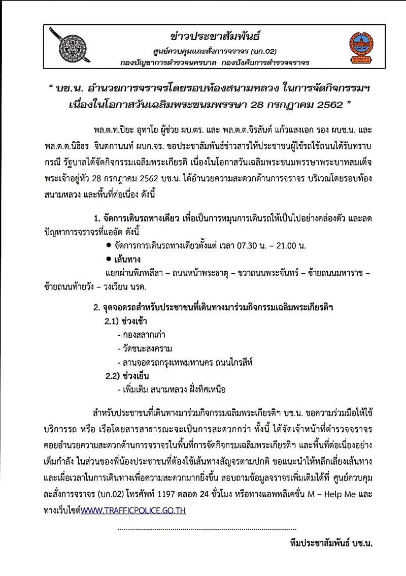 เมื่อวันที่ 27 กรกฎาคม พล.ต.ท.ปิยะ อุทาโย ผู้ช่วย ผบ.ตร. และ พล.ต.ต.จิรสันต์ แก้วแสงเอก รอง ผบช.น. และ พล.ต.ต.นิธิธร จินตกานนท์ ผบก.จร. ขอประชาสัมพันธ์ข่าวสารให้ประชาชนผู้ใช้รถใช้ถนนได้รับทราบ กรณีรัฐบาลได้จัดกิจกรรมเฉลิมพระเกียรติเนื่องในโอกาสวันเฉลิมพระชนมพรรษาพระบาทสมเด็จพระเจ้าอยู่หัว 28 กรกฎาคม 2562 บช.น. ได้อำนวยความสะดวกด้านการจราจร บริเวณโดยรอบท้องสนามหลวง และพื้นที่ต่อเนื่อง ดังนี้