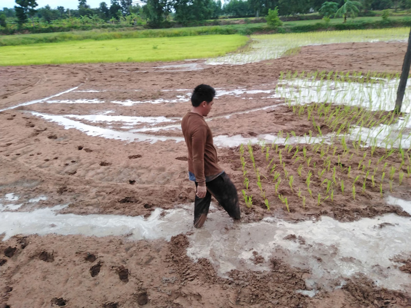 นายถนอม เอี่ยมศรี อายุ 43 ปี อยู่บ้านเลขที่ 135 ม.12 บ้านโคกไทรงาม ต.บ้านจารย์ อ.สังขะ จ.สุรินทร์ กล่าวว่า ตนเองมีที่นาประมาณ 10 กว่าไร่ ได้เข้าโครงการพระราชดำริ เพื่อผลิตพันธุ์ข้าวพันธุ์ดีกับมูลนิธิชัยพัฒนา โดยวิธีการทำนาแบบนาดำ โดยทุกๆปีฝนตกตามฤดูกาลไม่มีปัญหาเรื่องน้ำในการปักดำ มีปริมาณน้ำที่เพียงพอทำให้ผลผลิตที่ดี ได้เมล็ดพันธุ์ที่ผ่านเกณฑ์มาตรฐาน แต่ในปีนี้ฝนแล้งทำให้ไม่สามารถปักดำได้เลยได้แต่รอน้ำฝนมาเป็นเดือนจนกล้าที่หว่านไว้เริ่มแก่ ตนกลัวว่าไม่ทันการ โดยหน้านี้ตนได้ใช้เครื่องสูบน้ำจากบ่อที่ขุดไว้เพื่อมาลงแปลงทำให้ที่นาชุ่มพอมีน้ำคราดไถได้ปักดำนามาครึ่งแปลง แต่มาบ่ายวันนี้ได้มีฝนตกมาพอสมควรทำให้ที่นาชุ่มน้ำพอที่จะปักดำต้นกล้าได้ ตนและครอบครัว จึงรีบมาปักดำข้าวจนถึงตอนนี้ก็เย็นแล้วยังไม่เลิกเพราะถ้าทิ้งไว้พรุ่งนี้ไม่แน่ใจว่าดินจะแข็งตัวหรือเปล่าได้ภาวนาให้ฝนตกมาอย่างต่อเนื่องทั้งคืน เพื่อจะได้ดำนาเสร็จทันการทำนาในฤดูกาลนี้