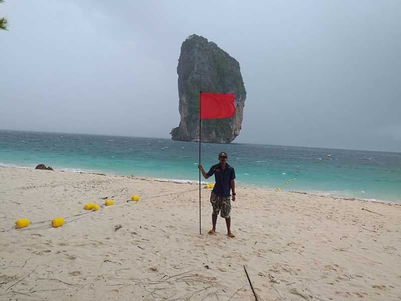 จังหวัดกระบี่ ขึ้นธงแดงเกาะปอดะห้ามเล่นน้ำ ขึ้นธงเหลืองเกาะไม่ไผ่ อ่าวไร่เลย์ เตือนนนท.-เรือนำเที่ยวระวังคลื่นลมแรง