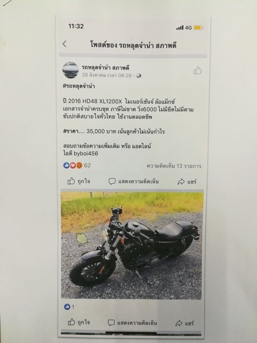 นายทวีศักดิ์ เปิดเผยว่า ตนกำลังมองหารถจักรยานยนต์ราคาถูก ต่อมามีเพื่อนที่รู้จักกันแนะนำว่าเพจนี้ขายของถูก ตนจึงถึงเข้าไปดูและเห็นว่ามีรถที่ตนชื่นชอบกำลังประกาศขาย ซึ่งระบุข้อความว่าปี 2016 HD48 XL1200X ไมเนอร์เชนจ์ ล้อแม็กซ์ เอกสารจำนำครบชุดภาษีไม่ขาดวิ่ง 6,000 ไม่มียึดไม่มีตาม ขับปกติสบายใจทั่วไทย ใช้งานตลอดชีพ #ราคา.... 35,000 บาท เน้นลูกค้าไม่เน้นกำไร สอบถามข้อความเพิ่มเติม หรือแอดไลน์ ไอดี byboi456