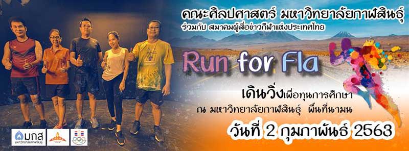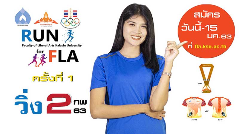 เมื่อวันที่ 29 พฤศจิกายน ผศ.นฤชิต แสนปากดี คณบดีคณะศิลปศาสตร์ มหาวิทยาลัยกาฬสินธุ์ กล่าวว่า ทางคณะศิลปศาสตร์ มหาวิทยาลัยกาฬสินธุ์ ได้ร่วมกับสมาคมผู้สื่อข่าวกีฬาแห่งประเทศไทย จัดงานเดินวิ่ง Run for FLA เดิน วิ่ง เพื่อทุนการศึกษา ครั้งที่ 1 ขึ้น เพื่อจัดหาทุนการศึกษาให้กับนักศึกษา คณะศิลปศาสตร์ มหาวิทยาลัยกาฬสินธุ์ ที่เรียนดีหรือมีความสามารถแต่ขาดแคลน