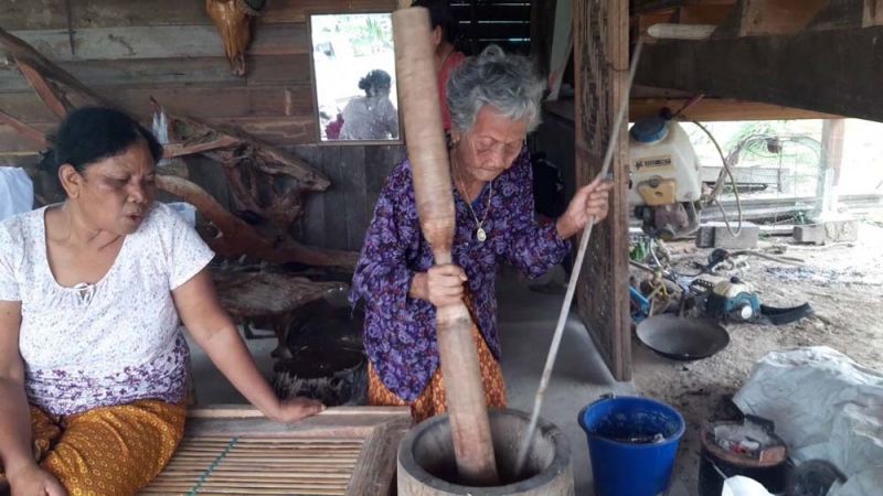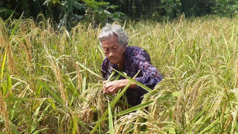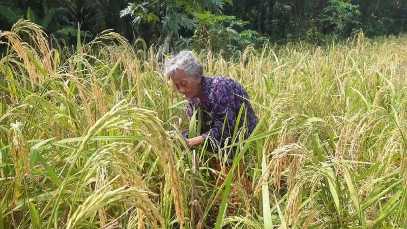 คุณยายเปี่ยม เล่าว่าสมัยก่อนพ่อแม่มีอาชีพทำนา ทำไร่ เริ่มเรียนรู้การทำนาตั้งแต่จำความได้ ทั้งปลูกข้าว เก็บเกี่ยว นวดข้าว ตลอดจนการตำข้าวเปลือก เพราะเมื่อก่อนไม่มีโรงสีข้าว เลี้ยงครอบครัวด้วยการทำนาทำไร่มาตลอด ปัจจุบันมีลูกทั้งหมด 7 คน ส่วนสามีได้เสียชีวิตไปประมาณ9ปีแล้ว ตอนนี้ก็อาศัยอยู่กับลูกๆ แต่ตนอยู่เฉยๆไม่เป็น ชอบทำโน่นทำนี่ไปเรื่อย แต่ได้ทำแล้วมีความสุข นอนหลับสบาย โชคดีที่บ้านลูก ที่อ.ลำทับ ยังมีการปลูกข้าวไร่ จึงขอออกไปเก็บข้าวด้วย แม้ว่าลูกหลานจะห้าม แต่ตนก็ยังมีแรงทำได้อยู่ ไม่ว่าจะเก็บเกี่ยวข้าว นวดข้าว ตำข้าวก็ยังทำได้ และไม่รู้สึกเหนื่อยอะไร