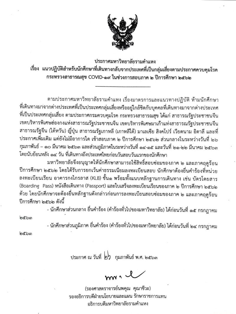 27 กุมภาพันธ์ 2563 สืบเนื่องจากเหตุการณ์การระบาดของเชื้อไวรัสโคโรนา หรือ โควิด-19 นั้น ล่าสุด มหาวิทยาลัยรามคำแหง ได้ออกประกาศเรื่อง แนวทางปฏิบัติสำหรับนักศึกษาที่เดินทางกลับจากประเทศที่เป็นกลุ่มเสี่ยง โดยให้นักศึกษาที่เพิ่งเดินทางกลับจากประเทศที่เป็นกลุ่มเสี่ยงหรือผู้ใกล้ชิดกับบุคคลที่เดินทางมาจากประเทศกลุ่มเสี่ยง นับย้อนหลัง 14 วัน ห้ามเข้าสอบส่วนกลาง และให้มายื่นคำร้องเพื่อเข้าสอบอีกครั้งตามวันเวลาที่มหาวิทยาลัยกำหนด