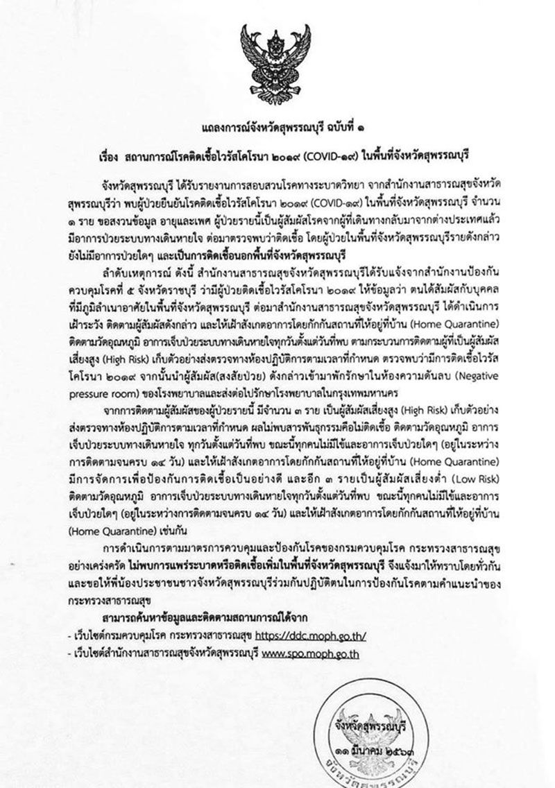 วันที่ 11 มีนาคม 2563 สาธารณสุขจังหวัดสุพรรณบุรี ยืนยันพบผู้ป่วยยืนยันโรคติดต่อไวรัสโคโรนา 2019 (Covid19) ในพื้นที่จังหวัดสุพรรณบุรี จำนวน 1 ราย โดยผู้ป่วยรายนี้เป็นผู้สัมผัสโรคจากผู้ที่เดินทางกลับมาจากต่างประเทศแล้วมีอาการป่วยระบบทางเดินหายใจ ต่อมาตรวจพบว่าติดเชื้อ