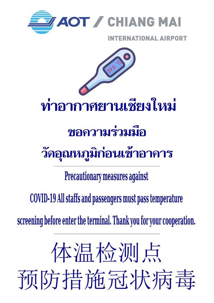 โดยในส่วนของท่าอากาศยานเชียงใหม่ จะเริ่มดำเนินการตรวจคัดกรองด้วยการวัดอุณหูมิร่างกายของผู้ที่จะเข้ามาภายในอาคารผู้โดยสาร และเขตปฏิบัติการเขตการบินทุกคน ตั้งแต่วันจันทร์ที่ 16 มีนาคม 2563 เป็นต้นไป จนกว่าจะมีประกาศเปลี่ยนแปลง เบื้องต้นกำหนดอุณหภูมิไว้ที่ 37.5 องศาเซลเซียส หากพบบุคคลใดมีอุณหภูมิสูงกว่าค่าที่กำหนดไว้ ก็จะดำเนินการตามขั้นตอนสอบสวนโรคต่อไป