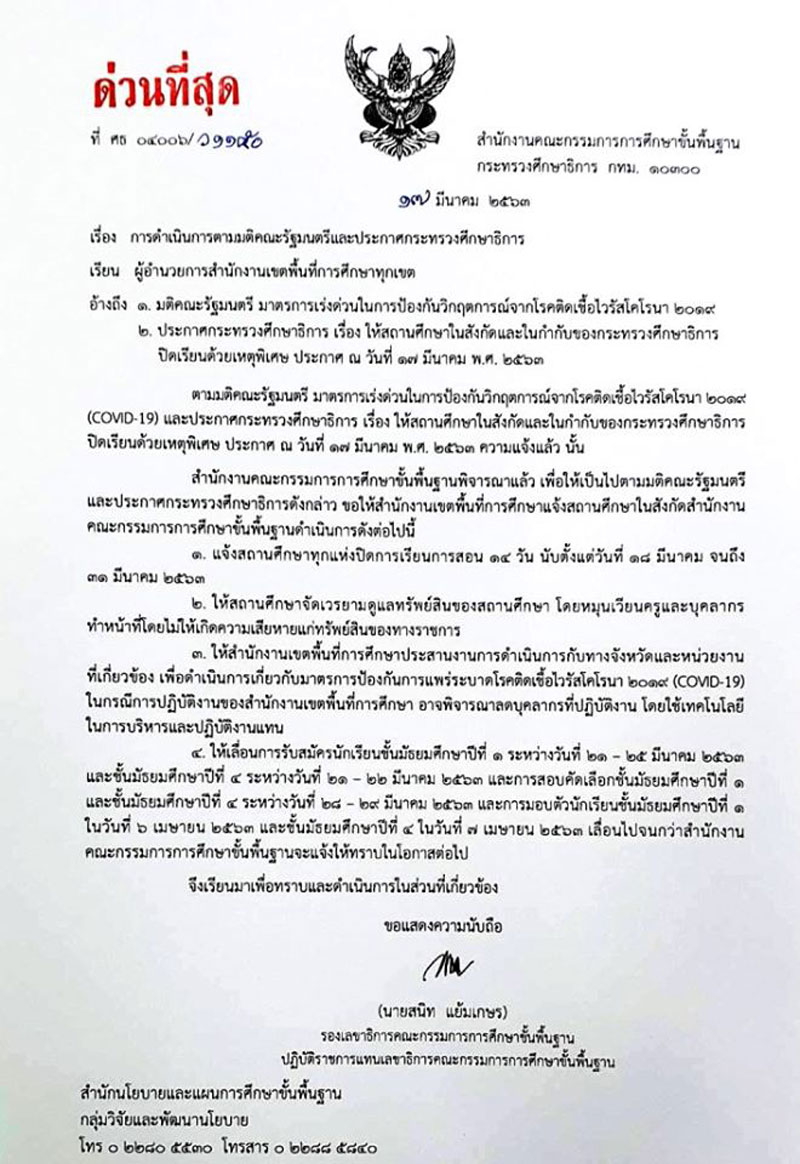 18 มีนาคม 2563 นายสนิท แย้มเกษร รองเลขาธิการคณะกรรมการการศึกษาขั้นพื้นฐาน ปฏิบัติหน้าที่แทนเลขาธิการคณะกรรมการการศึกษาขั้นพื้นฐาน ได้ลงนามในหนังสือ ด่วนที่สุด ศธ.04006/ ว1150 ลงวันที่ 17 มีนาคม 2563 เรื่อง “การดำเนินการตามมติคณะรัฐมนตรีและประกาศกระทรวงศึกษาธิการ” ไปถึงผู้อำนวยการสำนักงานเขตพื้นที่การศึกษาทุกเขต