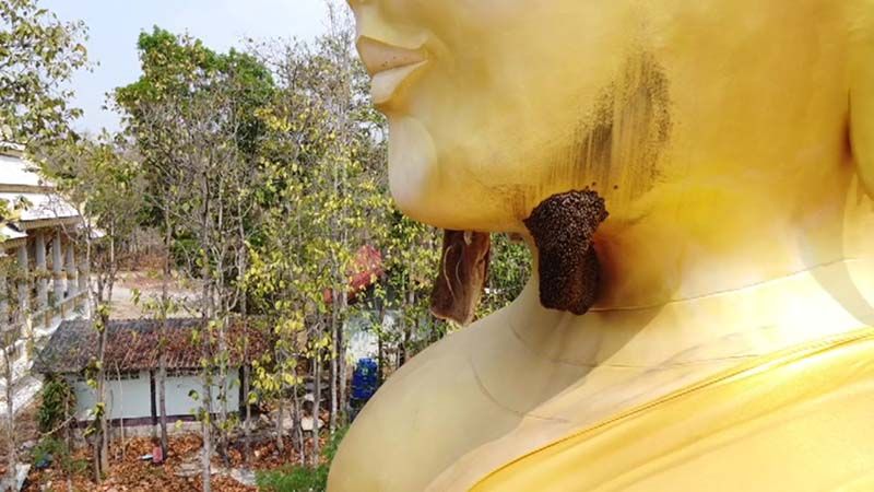 ซึ่งฝูงผึ้งหลวงจะย้ายออกในวันงานบุญของวัดช่วงเดือนมกราคมของทุกปี เป็นวันที่เปลี่ยนผ้าสไบห่มองค์พระ (สไบทิพย์) แล้วกลับมาใหม่อีกหลังจากเสร็จวันพิธีงานบุญ จะไม่หนีไปไหน ทั้งที่องค์พระตั้งอยู่กลางแจ้ง โดนทั้งแดด ลม และฝน ทำให้ชาวบ้านที่ผ่านไปมา รวมทั้งนักท่องเที่ยว ต่างเห็นเป็นเรื่องมหัศจรรย์ ซึ่งอาตมาเห็นว่าเป็นธรรมดาของสัตว์โลกที่เห็นว่าอยู่ตรงไหนสงบร่มเย็น ปลอดภัย ก็เข้ามาอยู่อาศัย ไม่ใช่เรื่องปาฏิหาริย์แต่อย่างใด นอกจากนั้น ยังมีชาวบ้านจำนวนมากมาขอโชคลาภ ซึ่งเป็นธรรมดา เป็นความเชื่อของแต่ละบุคคล ไม่สามารถห้ามได้