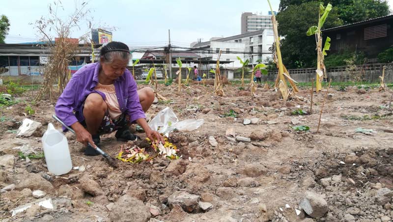 นางสมพิศ พันธุ์ไทย (เสื้อชมพู) อายุ 52 ปี ลูกจ้างโรงพิมพ์ไทยแลนด์การพิมพ์เปิดเผยว่า หลังจากโควิด-19 เริ่มระบาด และเริ่มมีมาตรการปิดเมือง ตนได้รับผลกระทบมากเช่นกัน ตนมีอาชีพเป็นลูกจ้างโรงพิมพ์ อาศัยอยู่ที่โรงพิมพ์ ได้ค่าแรงวันละ 200 บาทแต่โรงพิมพ์ได้รับผลกระทบมาก ลูกค้าแทบไม่มีเลย ทำให้ตนไม่มีรายได้ เมื่อเฮียชัยเจ้าของที่โทร.มาบอกให้ชาวบ้านใช้ประโยชน์ที่ดินได้ จึงมาปลูกพืชผักสวนครัวบริเวณนี้ ใช้ต้นทุนก็ไม่มาก แค่ไปซื้อเมล็ดพันธุ์จากร้านค้ามาปลูก และไม่ได้ใช้สารเคมีใดๆ เราปลูกเอง กินเองจึงปลอดภัย