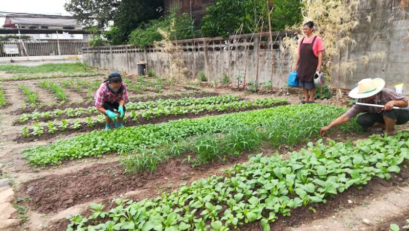 แต่ละครอบครัวก็เริ่มลงมือปลูกพืชระยะสั้นหลากหลายชนิด อาทิ ผักบุ้ง กวางตุ้งคะน้า กะเพรา โหระพา มันเทศ ฟักทอง ถั่วฝักยาว พริก มะเขือ ฯลฯ พืชผักบางชนิดเริ่มเก็บไปบริโภคในครัวเรือนได้แล้ว บางชนิดรอเวลา 1-2 เดือน ขณะที่ขยะที่ผู้คนมักลักลอบนำมาทิ้ง ก็เริ่มหายไปเช่นกัน หลังเห็นว่ามีคนมาใช้ประโยชน์ที่ดินแปลงนี้